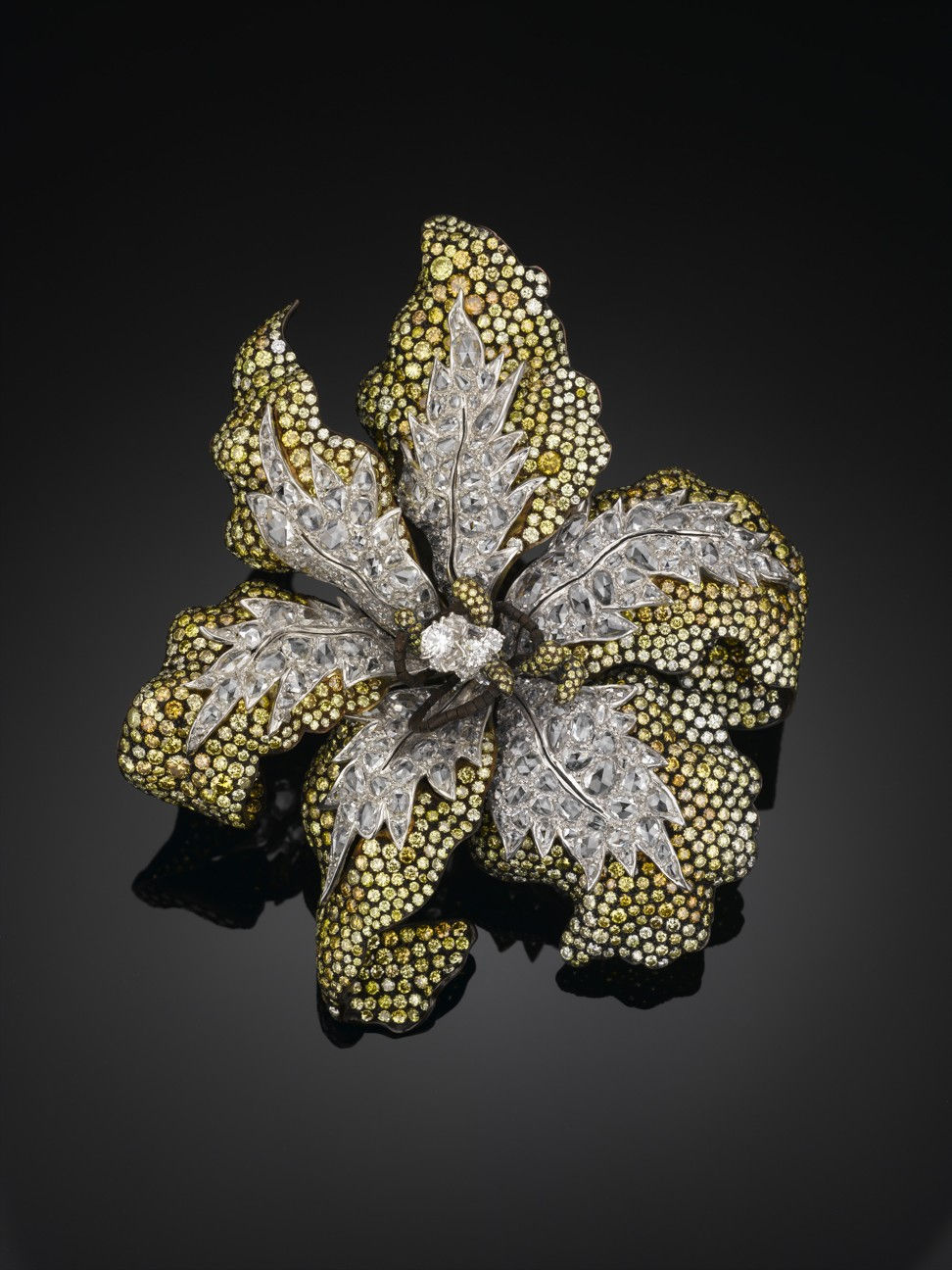 Ong’s Sunkissed floral brooch shimmers with yellow-to-brown diamonds. The yellow diamonds, she says, can accent a piece and bring a touch of light. “In Sunkissed, [they] add a lovely touch, and bring to mind a beautiful orchid bloom in the sunlight.”